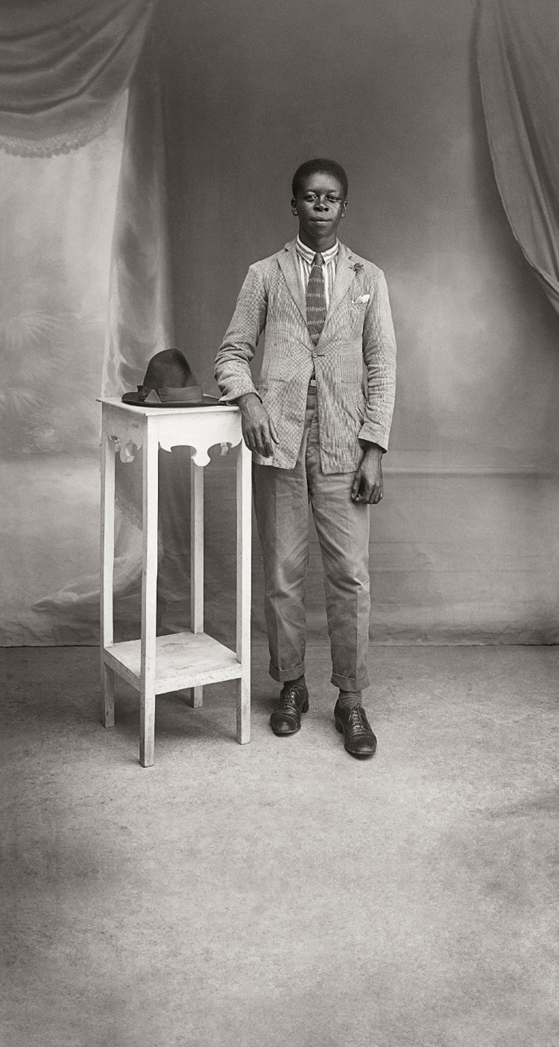 Anfitrião único e inaugural, foi posicionado à esquerda da entrada da Casa da Gávea. Está impregnado de responsabilidade. Não só recebe os visitantes como, antes de tudo, os acolhe. E o faz com doçura, além de firmeza. O sorriso é brando. Desenha-se mais nos olhos do que mesmo nos beiços dignos. A perna esquerda, discretamente projetada para a frente, indica o destemor com que se coloca diante da câmera. Atitude que pode ter adotado também na vida – espera-se. “Estamos aqui”, parece nos lembrar hoje, como se, sob as lentes de Chichico Alkmim, no início do século XX, antevisse este, no qual, ainda que de maneira insuficiente, espaços nobres do cenário político mundial seriam ocupados por seus descendentes, aqueles mesmos que viveram sob o infame jugo dos brancos.
