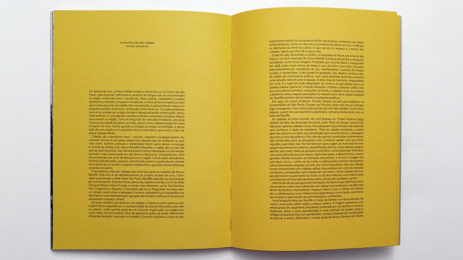 Catálogo da exposição com texto do curador Thyago Nogueira e fotografias do paulista Mauro Restiffe, reúne 50 imagens da cidade de São Paulo, realizadas em caminhadas pelo bairro da Luz em 2012 e por outros bairros, centrais e periféricos, como Brás, República, Pinheiros, Vila Congonhas e Itaquera.